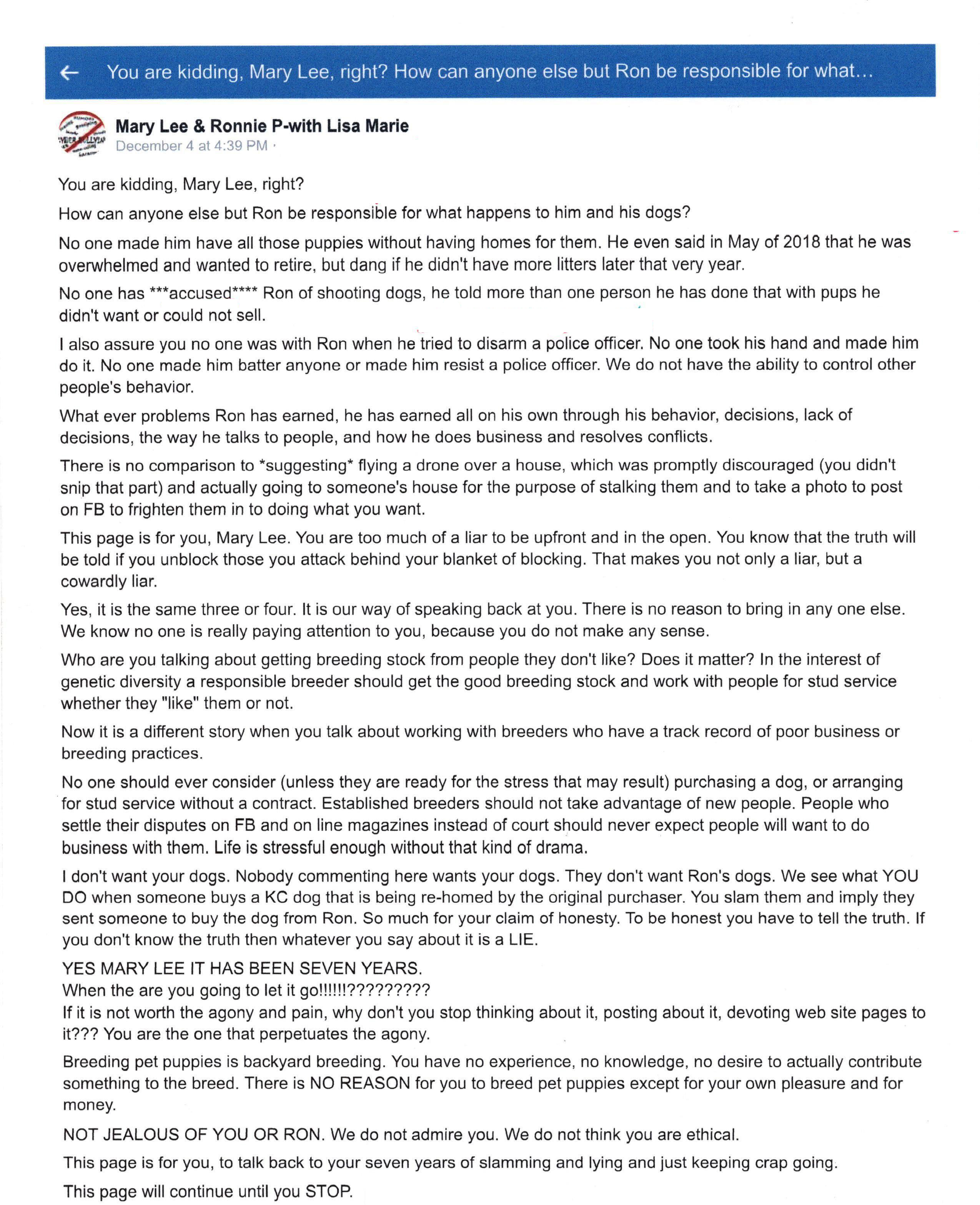 THE ONLINE FACEBOOK character assassination OF RON BOMBLISS. WHAT THE MULTI BREED BREEDERS DID TO A VETERAN WITH PTSD. THEY WERE TAUNTING A MAN THEY KEPT SAYING WAS MENTALLY IMPAIRED. WHAT KIND OF PEOPLE DO THIS? I KNOW THAT MANY OF THEM ARE SUPPORTERS OF THE AKC . I AM OF THE OPINION THEY DID THESE "HATE" CRIMES BECAUSE THEY WANTED TO BE ABLE TO SELL MORE DOGS OR HAVE THEIR RESCUE FRIENDS TAKE THE DOGS SO THEY COULD MAKE MONEY. THEY GET A BUNCH OF ALIASES TO MAKE IT LOOK LIKE MANY PEOPLE ARE BEHIND THEM AND THEN THEY LIE ABOUT THE PERSON THEY ARE TARGETING. YOU CAN READ ABOUT HOW THEY DO IT HERE: https://www.petition2congress.com/ctas/stop-illegal-destruction-death-row-dog-rescue. MOST OF HIS ACCUSERS HAD NEVER EVER STEPPED FOOT ON HIS PROPERTY. BELOW ARE SCREEN SHOTS OF PEOPLE WHO ACTUALLY WERE THERE. THEY WOULD ATTACK ANYBODY WHO TRIED TO DEFEND THIS MAN. HIS LIFE IS FOREVER DESTROYED AND THESE PEOPLE HAVE ABSOLUTELY NO REMORSE. SO THINK BEFORE YOU WANT TO BUY A "REGISTERED" DOG AND THINK ABOUT THE PEOPLE WHO DID THIS TO THIS MAN. I PERSONALLY CAN NEVER SUPPORT ANYBODY WHO IS CAPABLE OF WHAT THEY DO TO PEOPLE THEY ARE EITHER JEALOUS OF OR VIEW A COMPETITION FOR THEIR SALES. PEOPLE ACTUALLY POSTED THEY WANTED TO SHOOT HIM, THEY WANTED TO FLY DRONES OVER HIS HOUSE, THEY CONTACTED HIS NEIGHBORS FROM STATES AWAYS TO TELL THEM LIES, CALLED ANIMAL CONTROL TO LIE TO THEM,SAID THEY HOPED HE HANGS HIMSELF, AND THEY WOULD SIT IN FRONT OF HIS HOME AND HONK THEIR HORNS. THEY DID THIS TO A VETERAN WITH PTSD WHOM THEY ALL TAUNTED ON FACEBOOK DESCRIBING HIM AS BEING MENTALLY IMPAIRED. THESE ARE PEOPLE THAT WANT YOU TO BELIEVE THEY ARE BETTER THAN ANYBODY ELSE. ALL PUBLICLY POSTED. MAKING ME SICK TO SEE NOBODY WOULD DO ANYTHING TO STOP IT. NOT EVEN FACEBOOK