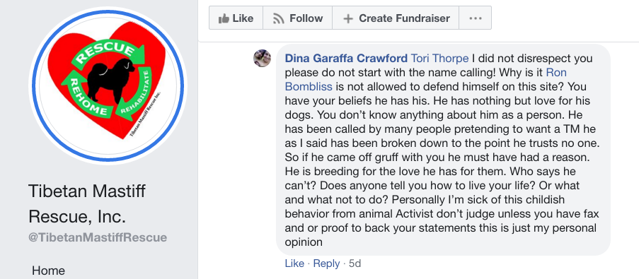 The woman who runs this site has done this to another breeder. She sends people to the neighbors, calls local police to make false reports. One of these "fake" reports resulted in Mr. Bombliss being wrongfully "tased" and his dogs let loose. Sadly, her lie cost the life of one of Mr Bombliss' dogs that was killed by a passing car during this horrendous incident. I believe this is just like the rescue below where a petition to Congress was started to stop these "terrorist rescue groups" who wrongfully attack breeders, take their dogs and resell them for their own profits. I know of one two breeders on this page who have profited off the "taking" of dogs they did not pay for after getting them from Mr. Bombliss. One of them is making videos, advertising training, and promoting himself as an expert on Tibetan Mastiffs with dogs he signed a contract to buy from Mr. Bombliss and did not pay for. Another breeder she "promotes" took at least 10 dogs from Mr. Bombliss and never paid him what she agreed to (what do you expect from someone perfectly capable of working yet living on disability?} I have watched for 10 years as these people have made false reports and accusations causing Mr. Bombliss' life, a man they claim is mentally ill, to be destroyed. These people have no morals so they feel no guilt for the damage they do to others. They profit off of the breeders they destroy. These are truly some of the most evil, nasty, malicious people I have ever met in my life. This page is a farce in my opinion run by a very nasty, narcissistic individual. Do not believe anything you read there. The person has done this before to another breeder, inciting people to harm and damage people they view as mentally ill in order to take their dogs for profit, an opinion I have formed over watching this person's behavior over the past 8 years. Disgusting if you ask me. Note in the screenshot below, this person is "plotting" to take "every single one of his dogs", a person they view as mentally ill, whose dogs are his lifeline, so they can profit off them while destroying his life. They lie, cheat, and "take" just like what we see going on by people like them in Washington D.C. If you don't fit their narrative, they will destroy you, and take everything you own. They live off of others. It's time to fight back against "retail rescues" like this. I urge everyone if you value your safety, do not deal with anybody on this Facebook page. I believe you will regret it.