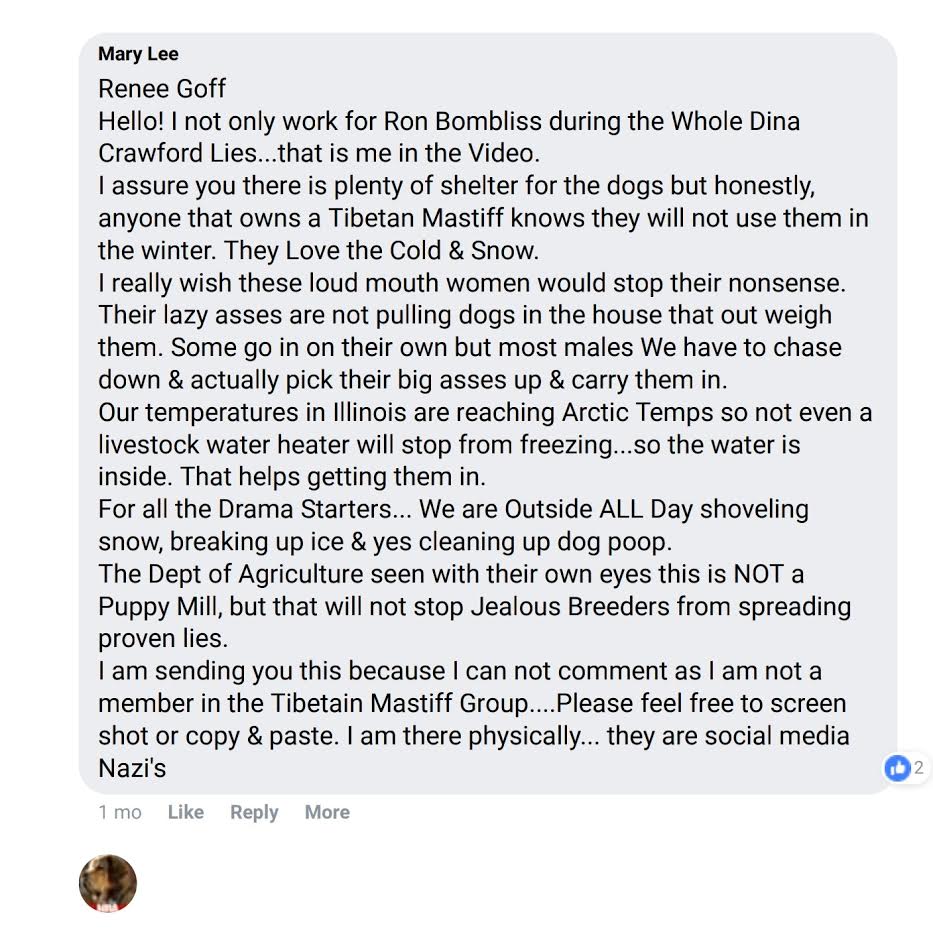 THE LIES NEVER STOP! THE OWNER OF THIS GROUP IS AT IT AGAIN WITH MORE LIES. I HIGHLY RECOMMEND THAT YOU NEVER BUY A PUPPY FROM ANY BREEDER ON HER PAGE. I KNOW OF TWO OF HER RECOMMENDED BREEDERS WHO HAVE GOTTEN DOGS FROM MR. BOMBLISS, WHOM THEY ATTACK RELENTLESSLY WITH LIES, WHO AGREED TO AND SOME SIGNED CONTRACTS TO BJY DOGS BUT NEVER PAID FOR THE DOGS. THAT IS WHY THEY SOLD THEM WITHOUT PAPERS. BECAUSE THEY WERE GOTTEN UNDER DECEPTIVE WAYS AND USED TO ENRICH THEMSELVES. I BELIEVE THIS TYPE OF OF BEHAVIOR COMES FROM BEING MORALLY CORRUPT. TO ILLUSTRATE AND GIVE EXAMPLE OF THIS MORALLY CORRUPT BEHAVIOR I KNOW THAT SOME OF THESE BREEDERS ARE ACTUALLY COLLECTING DISABILITY FROM THE GOVERNMENT WHILE BREEDING AND SELLING DOGS FOR EXTRA CASH. HAVE THEY CLAIMED THAT INCOME FOR DOGS THEY NEVER PAID FOR ON THEIR TAXES? GOOD HARDWORKING AMERICANS ARE PAYING FOR THEM TO STAY HOME AND COLLECT DISABILITY WHILE WE WORK TO PAY THE TAXES THAT ALLOWS THIS MORALLY CORRUPT BEHAVIOR. HOW CAN ONE BREED TIBETAN MASTIFFS OF ALL THINGS IF THEY ARE PHYSICALLY DISABLED? HOW CAN ONE INTERACT WITH PEOPLE TO "MAKE THE SALE" IF THEY ARE MENTALLY DISABLED? EXCUSES THEY HARD WORKING PEOPLE LIKE MYSELF HAVE TO PAY FOR. I HAVE THE EMAILS FROM MR. BOMBLISS SHOWING THE SIGNED CONTRACTS AND TEXT MESSAGES IF ANYONE WOULD LIKE TO SEE THEM. THIS PERSON HAS BEEN POSTED THESE OUTLANDISH STATEMENTS WITHOUT PROVIDING PROOF. SHE HAS "WHIPPED PEOPLE INTO A FRENZY", WITH THESE STATEMENTS INCITING PEOPLE TO THREATEN MR. BOMBLISS AND DESTROY HIS LIFE. NO, I WOULD NEVER RECOMMEND ANY BREEDER ON THIS FACEBOOK PAGE. IT'S OUTRAGEOUS. WHERE ARE THE VIDEOS OF THESE SO CALLED DOG KILLINGS? WHERE IS THE EVIDENCE. I HAVE WATCHED MR. BOMBLISS' LIFE BEING DESTROYED FOR THE PAST 10 YEARS BY THESE PEOPLE'S LIES. I HAVE WATCHED HIS HEALTH AND HOME DEGRADE. THEY DID THIS TO HIM. THEY ILLEGALLY TAKE VIDEOS INSIDE HIS HOME WITHOUT HIS PERMISSION. A HOME THAT USED TO BE NICE BUT HAS DETERIORATED BECAUSE OF THEIR ATTACKS ON HIM. THEY CALL HIM MENTALLY ILL YET THEY CONTINUE TO PUBLICLY ATTACK HIM WITH LIES WHICH I BELIEVE IS A HATE CRIME. THESE ARE THE SAME KIND OF PEOPLE WHO LIED ABOUT PRESIDENT TRUMP AND STOLE THE ELECTION, THEY HAVE NO MORALS. ALL THEY HAVE IS LIES AND FAKE OUTRAGE. I SERIOUS DOUBT THEY CARE ABOUT THE DOGS, ONLY THE MONEY THEY CAN MAKE OFF THE DECEPTIVE WAYS THEY CLAIM TO GET THEM. BEWARE. WOULD YOU WANT TO GET INVOLVED OR TANGLED UP WITH SOMEONE WHO WOULD PUBLICLY MAKE THESE OUTRAGIOUS STATEMENTS OF SOMEONE WHO THEY BELIEVE IS MENTALLY ILL? BE CAREFUL WHO YOU FRIEND. BE CAREFUL OF THIS GROUP. THEY MAY JUST DO THE SAME TO YOU. YOUR LIFE COULD BECOME ENDANGERED LIKE MR. BOMBLISS' BECAUSE OF THEM.